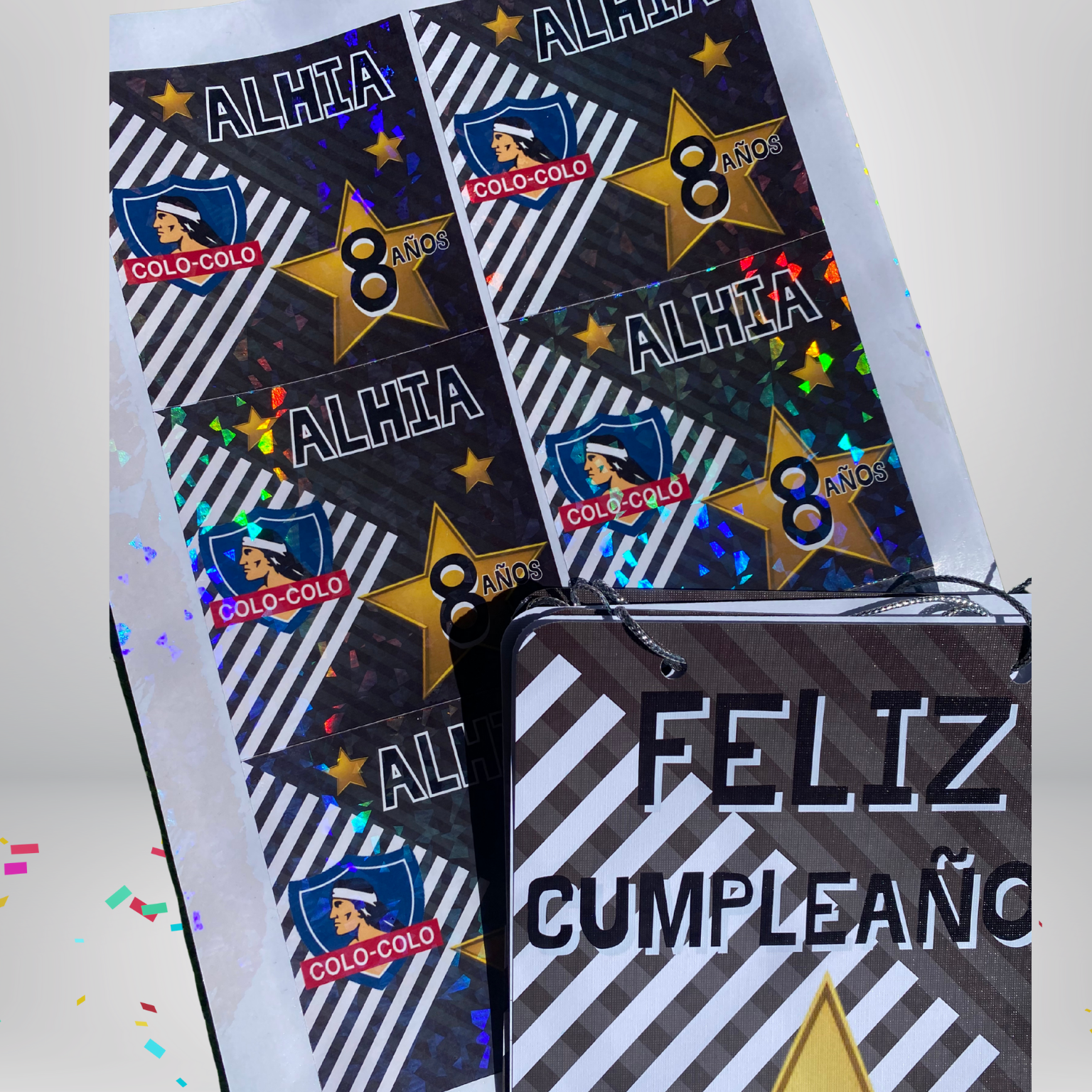 Stickers en adhesivo holográfico iridiscente, resistentes y de alta definición. Perfectos para branding, packaging y regalos. -